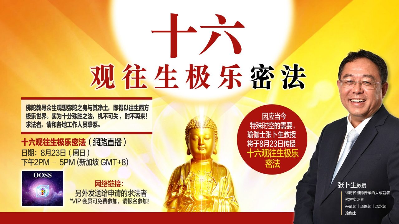 因应当今特殊时空的需要,瑜伽士张卜生教授,将于8月23日,传授”十六观往生极乐密法”。