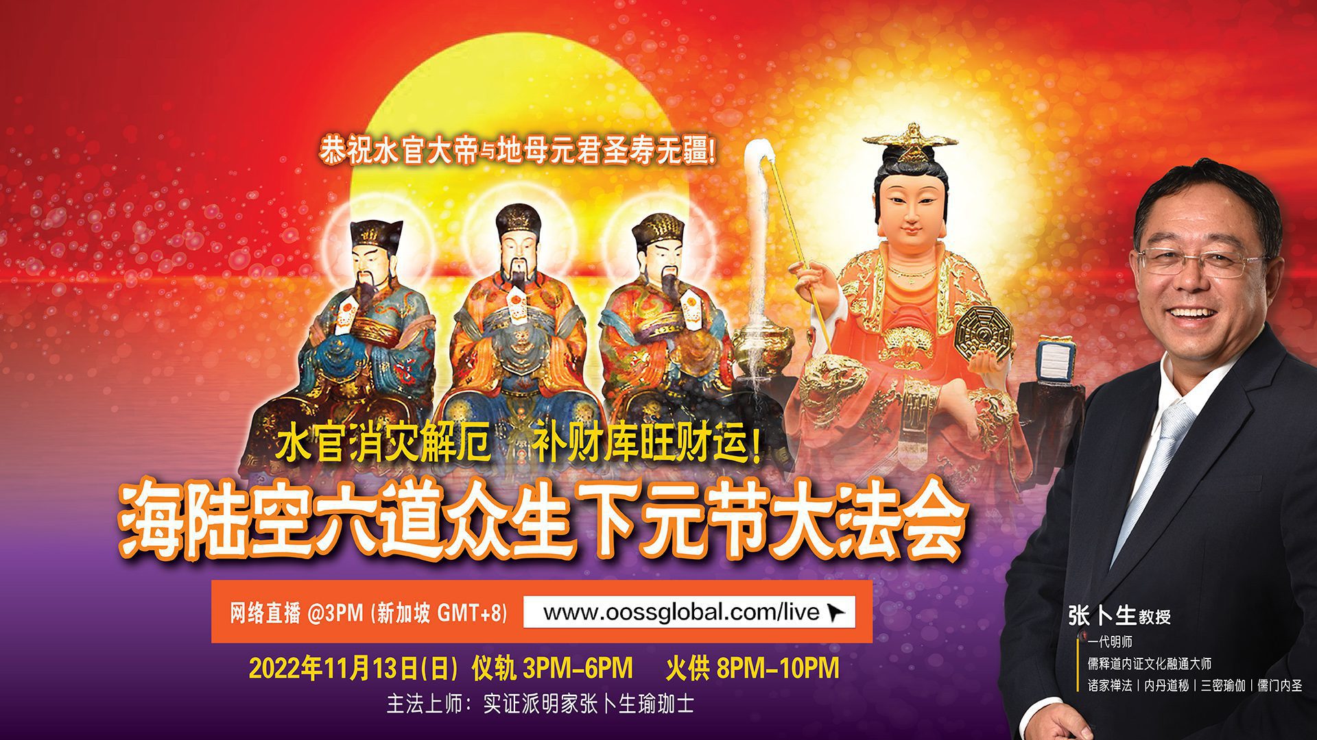 農歷十月十五,是「三官大帝之水官洞陰大帝」的誕辰。三官大帝之一的水官大帝是掌管水界之神尊,地位僅次於玉皇大帝。相傳當天,水官大帝會下凡人間除困解厄、排憂解難。這一天,是人們祭祀祖先,並祈請水官大帝消災解厄、賜財賜福的大吉之日!祈願消災解厄,解三災、四煞厄、五行厄、六害厄、七傷厄、八難厄、九星厄、夫妻厄、男女厄、生產厄、疫癘厄、精邪厄等一切苦厄! 恭拜下元水官大帝,所有厄難都解除!