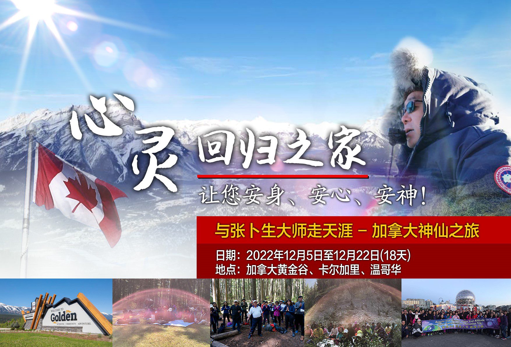 冬天修炼,目的是修到骨、脏腑和细胞的深层,促使基因密码的根本改变!在这个特殊的时空场里,我们将在黄金镇、班夫、路易斯湖和卡尔加里完成15天的闭关。借助天时地利,就可与这只巨大的生龙,进行全息一体的修炼,为开启生门、积功消业、成就今生奠定坚实的基础!恩师的用心可谓良苦!