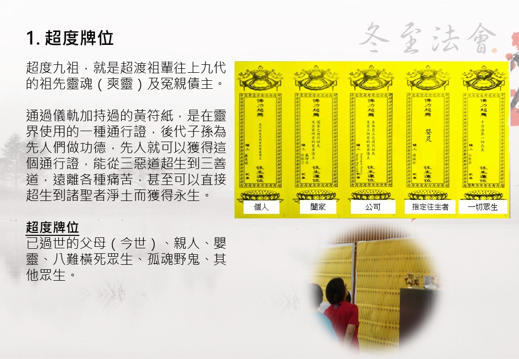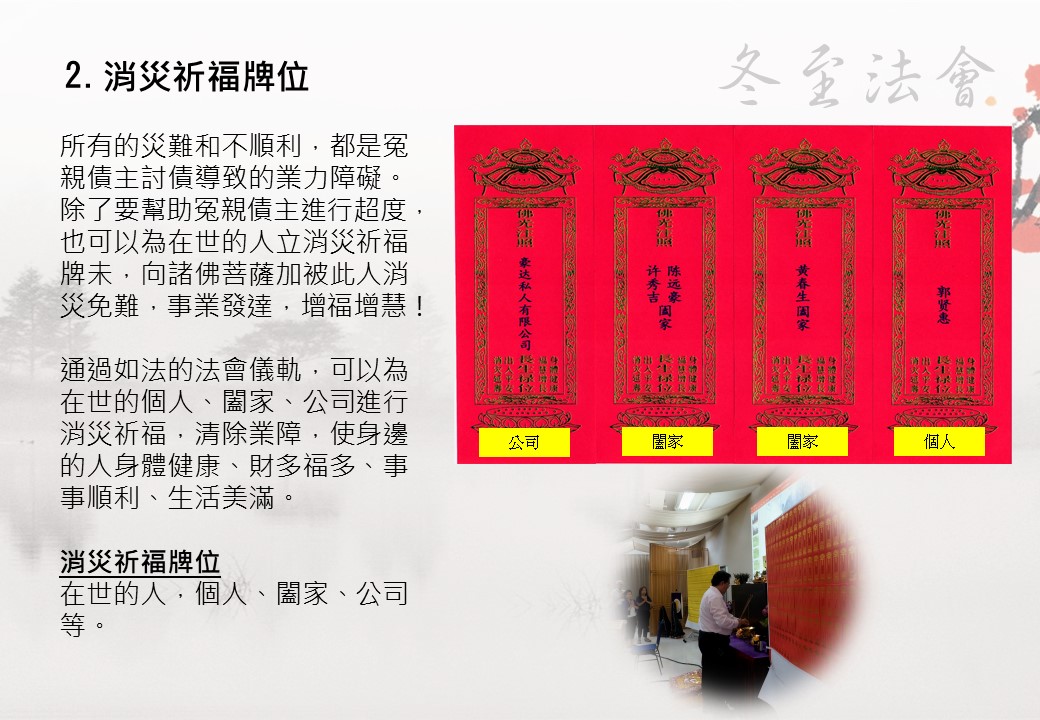冬至这一天,万物的能量都凝聚在自己的内心,人的能量也会凝聚在自己的真心里面。当凝聚完成之后,阴极阳生,由阴聚开始产生阳动。所以我们要把握住“冬至一阳生”的时节,通过内炼启动丹田里的明火,通过法会来帮助自己和祖先九祖进行清因消业,清除体内的业力黑子,帮助我们快速地将体内能量由阴转阳。要使体内阴阳和谐放光,与天地一起同频共振,让体内的能量旺旺地生起,照除一年来的霉运,在新的一年,家旺、财旺、身体旺,一切都旺!